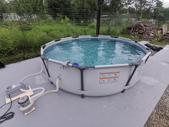 Купили однажды на дачу каркасный бассейн. Так как покупка была спонтанной то понимания куда его ставить небыло и поэтому первый год стоял на земле с тентом сверху. Сама концепция не устроила так как небыло ровного и стабильного основания. Да и прямой контакт с землёй обеспечивал в бассейне присутствие жуков плавунцов =)