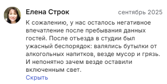 Спустя пару месяцев мы заселились в другой отель и арендадатель показал нам что у нашего профиля низкий рейтинг (мы жили только у Елены) и написан страшный отзыв об алкашах, загаженой квартире и прочих ужасных вещах