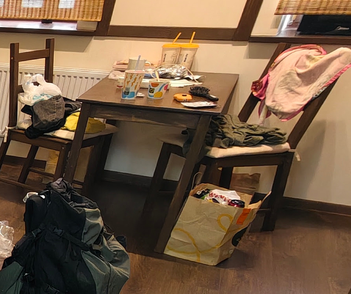 (мусор собран в одном месте, у обеденного стола, стаканы сувенирные забраны с собой)