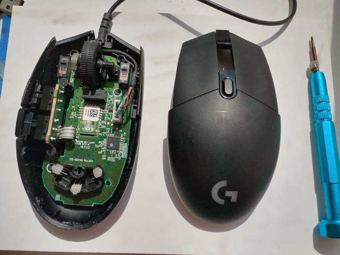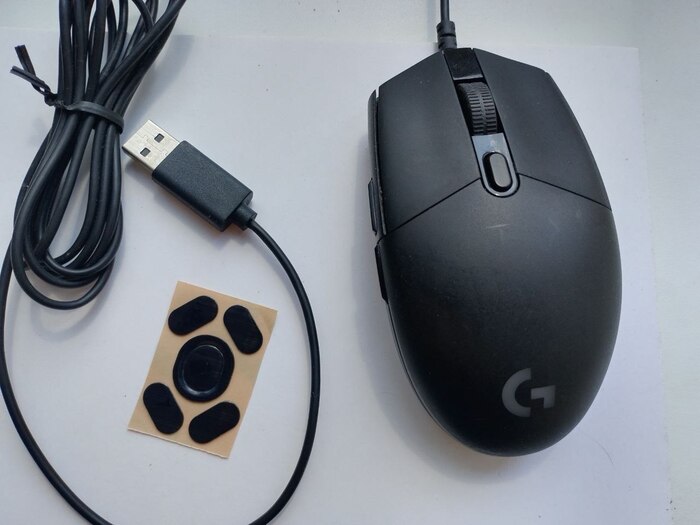 Сегодня я расскажу как разобрать и починить двойной клик на одной из самых массовых и доступных игровых мышей Logitech g102. Чтобы разобрать мышь, нам потребуется острый предмет типа ножа (не порежьтесь) и отвертка крестовая с битой 1,5 мм. В идеале у вас должен быть куплен комплект новых ножек. Чтобы сохранить старые, нужно аккуратно подковырнуть и снять две ближние к проводу ножки или глайды (осторожно, они двухслойные, нужно попасть ножом к самому дну паза и просунуть лезвие), а так же проколоть отверткой наклейку на днище - под ней спрятан третий болт.