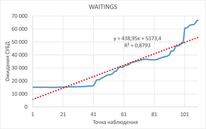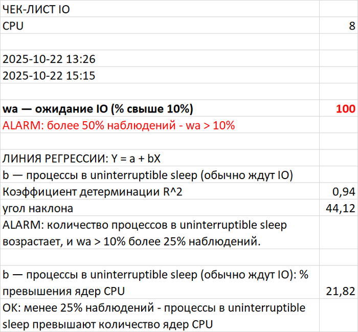 Корреляция между ожиданиями СУБД типа IO и временем ожидания (wa) / количеством процессов в состоянии сна(b) - признак возможных проблем с дисковой подсистемой сервера СУБД.