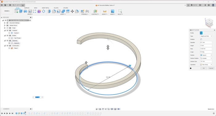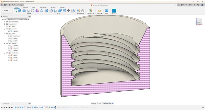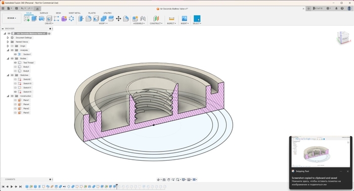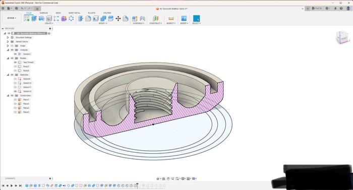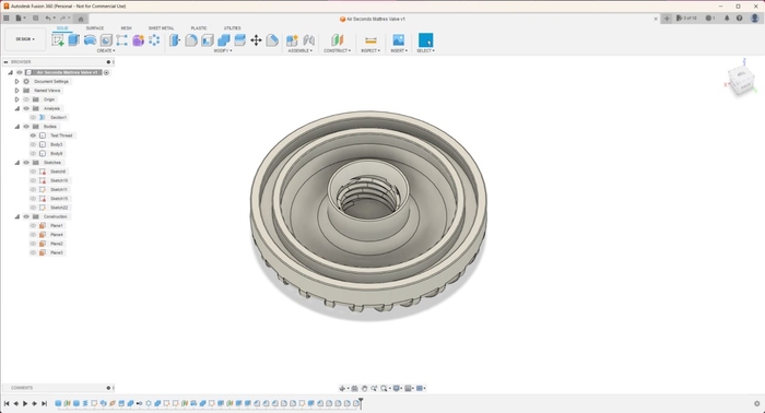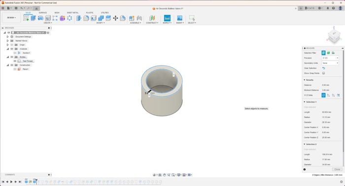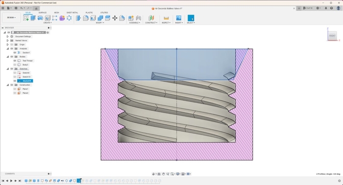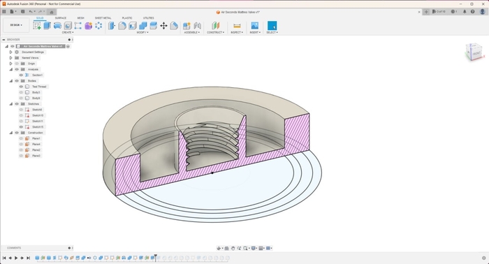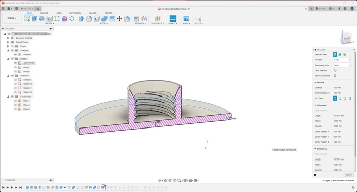 Начал я с того, что сперва начал изучать резьбу клапанной крышки. Как оказалось, она была не совсем простая, а аж 4-х заходная. Сперва решил замоделить именно её, т.к. для меня это было самым сложным местом, особенно учитывая, что из измерительных инструментов был только советский штангенциркуль и линейка. В довесок к этому во Fusion 360, который я использую в качестве CAD нет поддержки многозаходных резьб. В общем сделав несколько замеров, начал ваять. Сперва решил сделать несколько быстрых пробников для проверки резьбы (и как оказалось не зря). Для этого сперва замоделил «стакан» в котором будет «нарезаться» резьба: