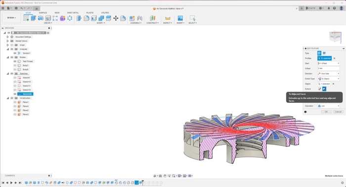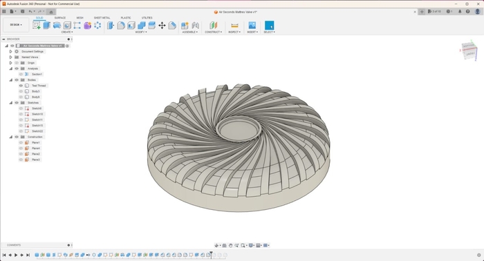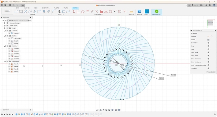 Далее настала очередь небольших украшательств. На оригинальной крышке был спиральный узор, который в тоже время практичен: не давал проскальзывать руке при закручивании/откручивание крышки. Я решил сделать нечто подобное, но уже не заморачиваясь с «копийной» точностью. Для этого набросал эскиз используя пару кривых и снова круговой паттерн: