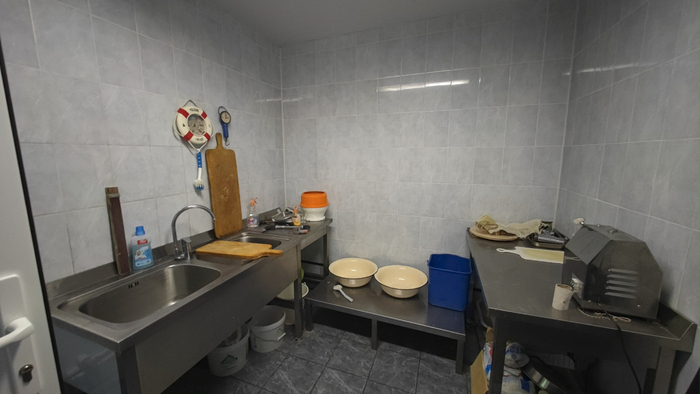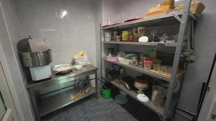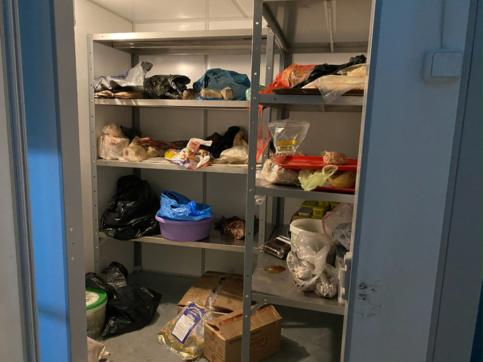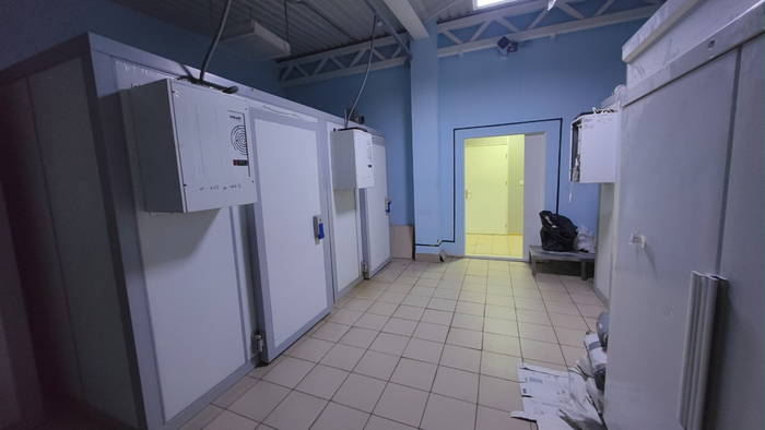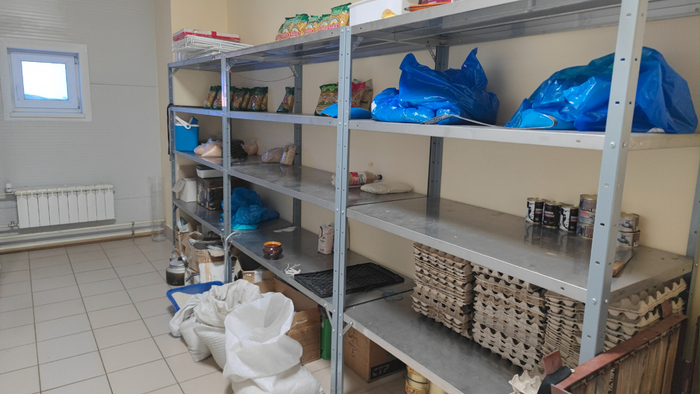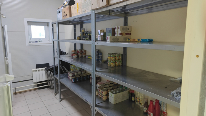 Склады для хранения продуктов: свежих и замороженных, огромные морозилки, помещения для круп, макарон, консервов.