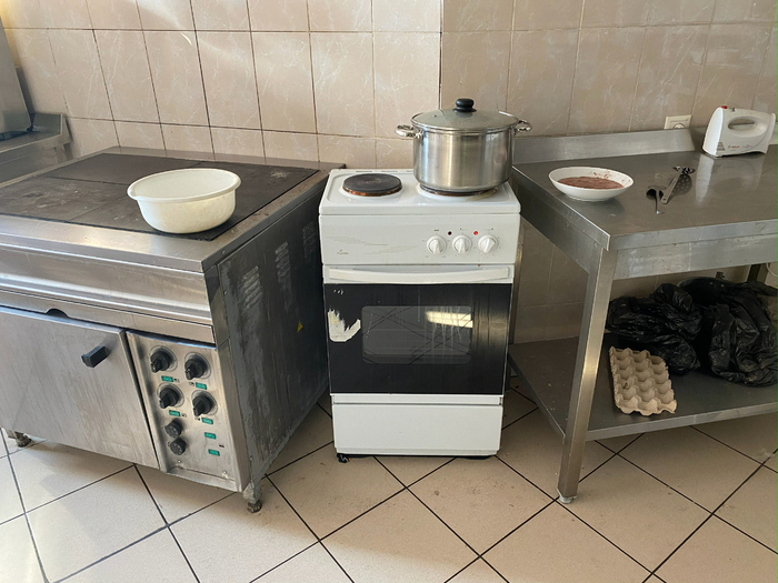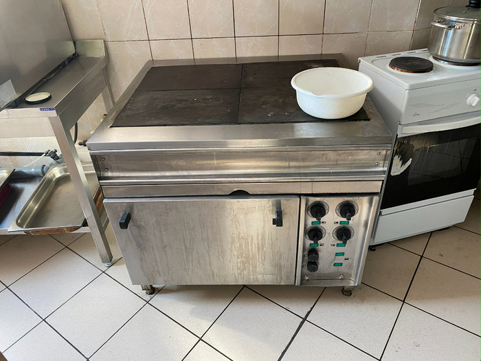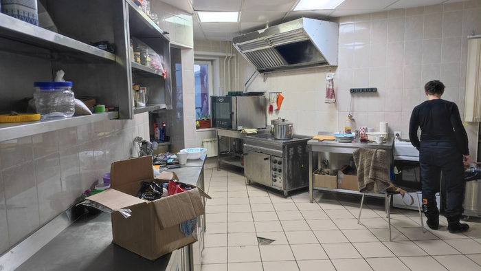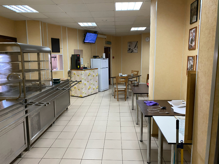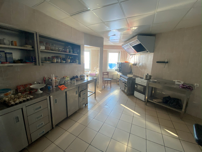 Идём дальше. Есть большая столовая с раздачей, просторная кухня с современным оборудованием: печи, духовые шкафы, микроволновки, холодильники.