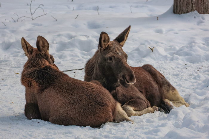 На фермах молодые лоси живут обособленными группами, как в детском саду — в природе не так. Вот, например, Кука, Мура и Михась — лосята, которым ещё нет годика. Эта банда живёт в отдельном загоне с рождения и совсем не пересекается со взрослыми: