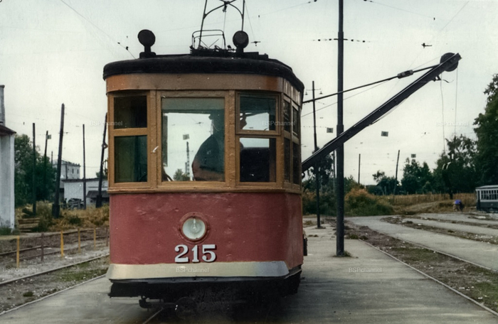 Эти снимок был сделан на территории трамвайного депо. Тогда трамвайная сеть активно развивалась: прокладывались новые маршруты, обновлялся подвижной состав, а для обслуживания путей использовался разнообразный специальный трамвайный транспорт — краны, снегоочистители, монтажные вышки и другая техника. Многое из этого изготавливалось прямо в депо, руками умелых сотрудников из списанных или переоборудованных вагонов.