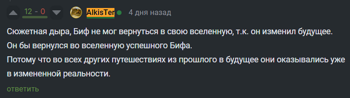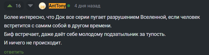 Как-то так. Еще раз напомню, что описанные вещи не делают фильмы плохими, да и то, что трилогия не идеальна с точки зрения внутренней логики и характеров персонажей, не делает ее плохой, да, не идеальной, но далеко не плохой. Фильмы все еще имеют отличную внутреннюю структуру, и хоть мой любимый фильм в трилогии первый, я с удовольствием периодически пересматриваю все три фильма. А есть ли у вас какие-нибудь заметки на полях в отношении «Назад в будущее»?