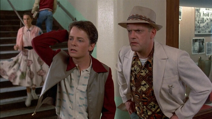 Напомним в самых общих чертах ход событий трилогии. В начале первого фильма Дока убивают враги Америки, ливийские террористы. На переделанном в машину времени DeLorean Марти перемещается в 1955 год, где вместе с Доком пытается исправить будущее, чтобы в него вернуться. Там же он встречает своих родителей. К разочарованию Марти, его будущий отец — хлюпик, в которого просто невозможно влюбиться. Герой исправляет ситуацию, чтобы отправиться уже в 2015-й, позаботиться о взрослом себе и своих детях. Вечный враг Марти, Бифф Таннен, умудряется переместиться в 1955-й и превратить 1985-й в ад на земле, где он трампоподобный могущественный олигарх. Марти опять оказывается в пятидесятых и действует параллельно событиям первого фильма, стараясь не допустить пространственно-временных парадоксов. Наконец, в третьей части герой отправляется за Доком на Дикий Запад.