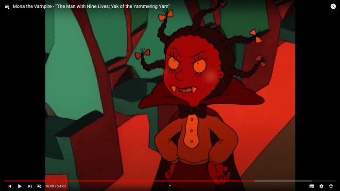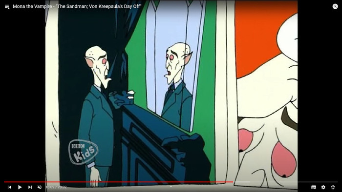 1) "Мона-вампир"/"Mona the Vampire" - канадский мультсериал 1999 года о Моне Паркер - девочке с богатым воображением, которая считает себя супергероем и мысленно борется со злыми существами. Там был очень колоритный персонаж Фон Крипсула, который по сюжету якобы ожил и вышел из страницы комикса, что бы захватить мир. Вот только серии с его участием и произвели на меня впечатление, так как я с детства почему-то полюбила вампирскую тематику. Меня очень интересовал вопрос, а знал ли он, что Мона на самом деле не вампир, а переодетый человек?