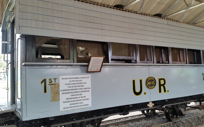 Табличка на вагоне повествует о том, что именно в этом вагоне в июне 1900 года Чарльз Генри Рьялл, суперинтендант полиции, встретил свой конец в пасти льва - людоеда.