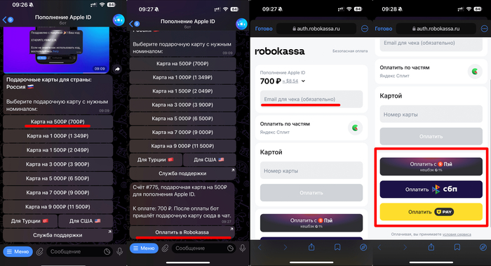 Мы создали телеграм-бота, который позволяет быстро купить подарочную карту Apple, а дальше благодаря ей можно пополнить счёт. Мы не скрываем: в нашем боте есть НАЦЕНКА, и это нормально для нас, так как мы потратили немало сил, нервов и времени. И ещё у нас есть активная служба поддержки, поэтому клиент не остаётся с «машиной» один на один. Проект сделан для тех, кто по разным причинам не может пополнить свой баланс (таких людей как оказалось много).