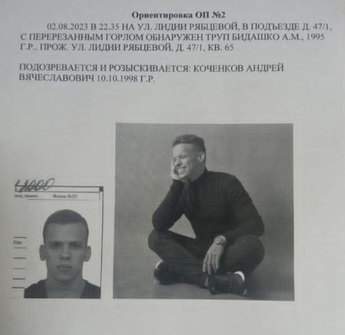 Главным подозреваемым в убийстве стал Андрей Коченков. Его немедленно объявили в розыск, однако поймать злодея по горячим следам не удалось. Отследить телефон мужчины тоже не получилось, он избавился от него днём 2 августа, отправив перед этим короткое сообщение своей матери: