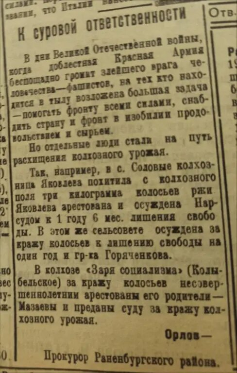 В дни Великой Отечественной войны, когда доблестная Красная Армия беспощадно громит злейшего врага человечества - фашистов, на тех, кто находится в тылу возложена большая задача - помогать фронту всеми силами, снабдить страну и фронт в изобилии продовольствием и сырьем. Но отдельные люди стали на путь расхищения колхозного урожая. Нак, например, в с. Соловые колхозница Яковлева похитила с колхозного поля три килограмма колосьев ржи. Яковлева арестована и осуждена Нарсудом к 1 году 6 мес. лишения свободы. В том же сельсовете осуждена за кражу колосьев к лишению свободы на один год гражданка Горяченкова. В колхозе "Заря социализма" (Колыбельское) за кражу колосьев несовершеннолетним арестованы его родители - Мазаевы и преданы суду за кражу колхозного урожая.