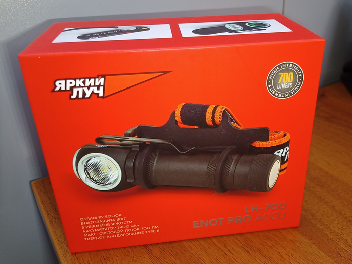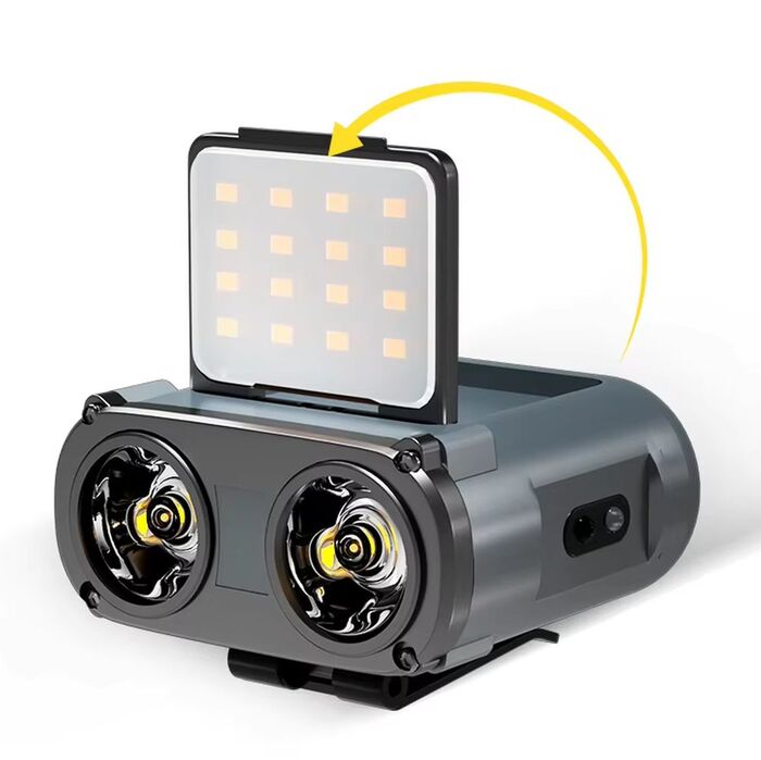 Необычная компактная модель налобного фонарика оснащенного двумя раздельными светодиодами с линзами в качестве основного источника света со световым потоком 500Лм). Между ними дополнительно установлено небольшой аварийный световой мерцающий сигнал красного цвета. Фишкой устройства является откидывающаяся под углом дополнительная световая панель для получения широкой освещенной зоны. Фонарик подойдет не только в качестве налобного, но и может служить подвесным источником света, а так же его можно крепить на руле велосипеда с помощью идущего в комплекте крепления. Кроме этого, специальная прищепка на корпусе позволяет его закрепить на козырек кепки. Доступно пять режимов работы устройства. Встроенная аккумуляторная батарея имеет емкость 1500мАч. Несколько цветов корпуса на выбор на странице товара.