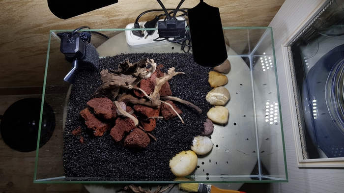 В предыдущем посте в комментах писали, что раков тетрадоны разорвали на куски, оба моих успешно пережили линьку и теперь осваивают скалолазанье по отвесным стенкам аквариума, пока рекорд до середины. И опять же ноль внимания со стороны рыб.