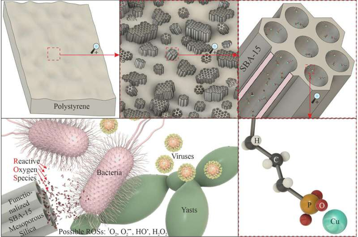 В отличие от традиционных наночастиц золота или серебра, которые требуют прямого контакта и быстро изнашиваются, B-STING — это пористый диоксид кремния с мезопорами диаметром 8 нм, упорядоченными, как пчелиные соты. Внутри пор иммобилизованы отдельные атомы меди, изолированные друг от друга пропильными мостиками. Каждый атом — эффективный одноатомный катализатор, способный преобразовывать воду и кислород из воздуха в АФК без внешней активации (света, ультразвука, электричества). Материал работает даже в темноте и не требует регенерации — он живёт, пока есть воздух и влага.