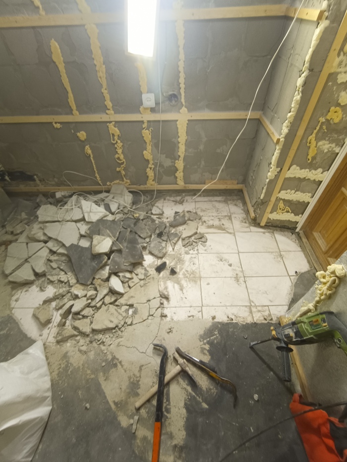 А после было так. Виден второй слой плитки. К сожалению, не сделал фотографий после полного демонтажа, там пришлось второй слой плитки с клеем снимать. В данный момент стяжка сделана, новая плитка уложена.
