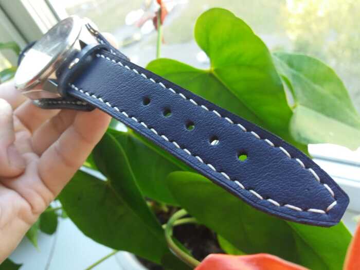 Синяя кожа и белая нить, сочетаются с циферблатом часов.