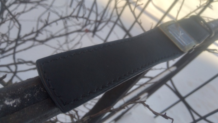 Чёрный ремешок прошит коричневой нитью седельным швом.