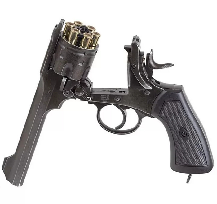Револьверы Веблей имели так называемую переломную конструкцию – их ствол и барабан соединялись с колодкой УСМ с помощью шарнира, а для перезаряжания откидывались. После откидывания ствола револьвер переворачивался, и стреляные гильзы выпадали из барабана под собственным весом.