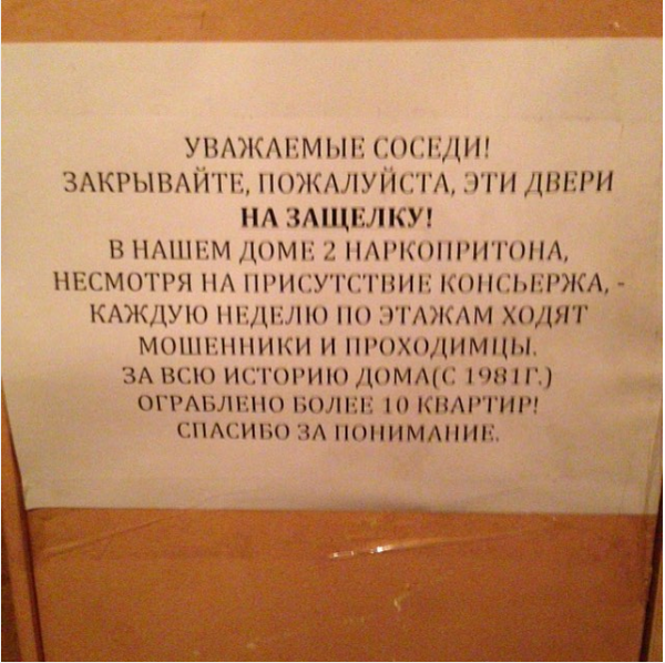 Жизнь пошла своим чередом, ор из-за стены, ор в подъезде, ор в тамбуре. Вечно выбиваемые двери в подъезд и тамбур.