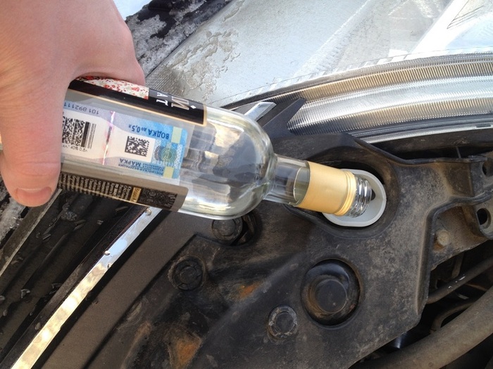 Рецепт самодельной «незамерзайки» предельно прост: немного разбавляем алкогольный напиток водой (а лучше не разбавлять) и заливаем его в бачок с омывающей жидкостью. Кое-кто обогащает эту смесь синькой или ароматизатором, что делает ее больше похожей на настоящий продукт и даже устраняет характерный запах, который может кому-то показаться неприятным, но мы считаем это пустой тратой времени и ресурсов – у нас ведь час икс в самом разгаре, какая, к черту, синька?!