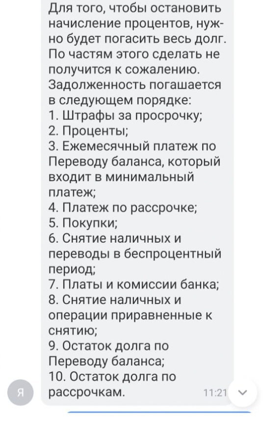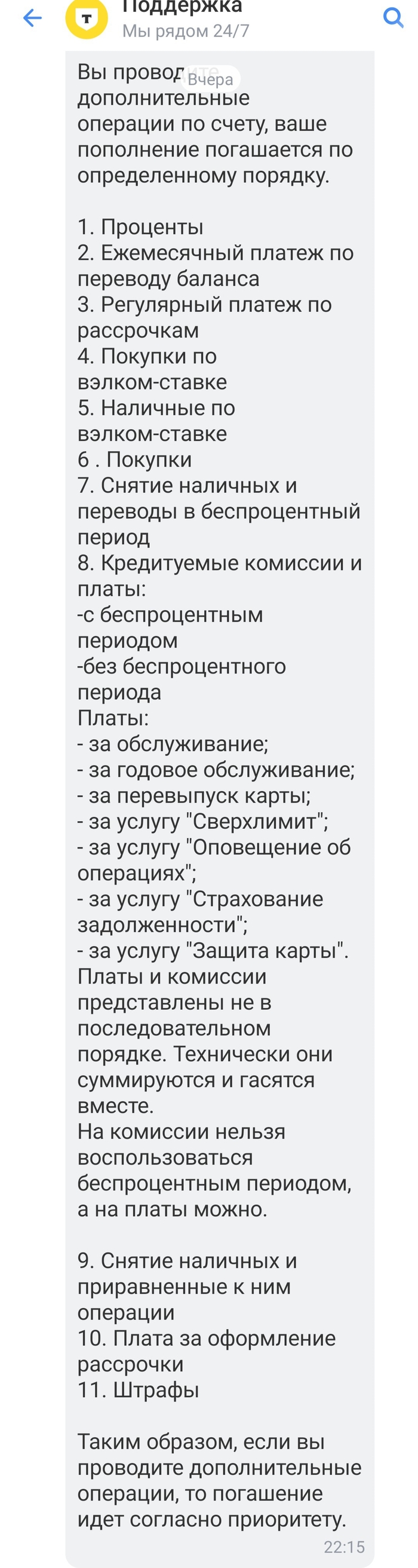 Пробившись через бота, написал в чат. Оператор предоставил новую информацию по порядку погашения задолженности (вообще без указания очередности погашения задолженности по переводу баланса):