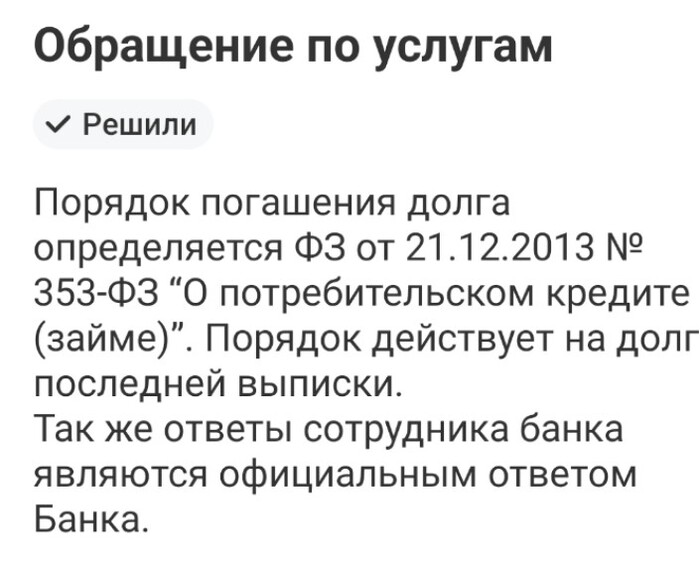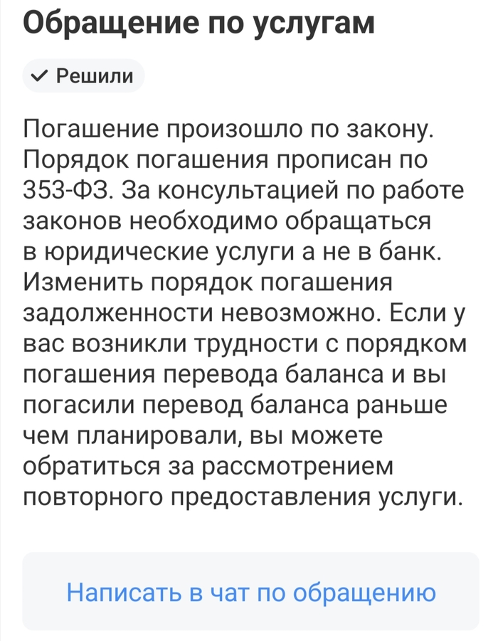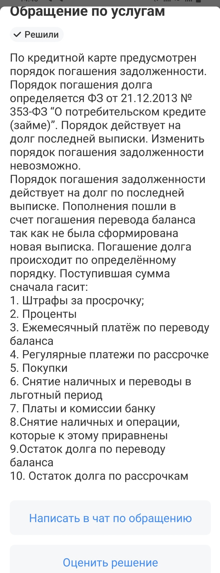 Дальше поддержка начала аргументировать списание, противоречащее информации на сайте и предварительной консультации в чате со специалистом банка отсутствием сформированной выписки на момент погашения. На мои настойчивые просьбы дать конкретную ссылку на документ, в котором указано, что при отсутствии выписки погашается в первую очередь задолженность по переводу баланса с беспроцентным периодом 180 дней, а не задолженность по с беспроцентным периодом 55 дней, поддержка туманно пишет "ФЗ-353" либо УКБО для физ лиц. Но ни в том, ни в другом документе нет указаний на приоритетное погашение именно по задолженности по услуге перевода баланса.