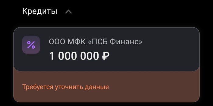 Увидев что одобрен заем в ООО МФК "ПСБ Финанс" я ощутимо напрягся, но ведь в офисе меня уверили что заявку я оформлял на кредитку, а джентльмены верят на слово. Проверил на всякий случай приложение, и никаких дополнительных уведомлений там не обнаружил. Заявку на выдачу то ли карты, то ли кредита, то ли хуя за щеку висела в статусе "Требуется заполнить данные" (или что-то подобное, скрин на тот момент не сделал, жопа не так явно чуяла подвох).