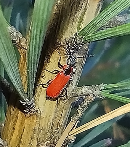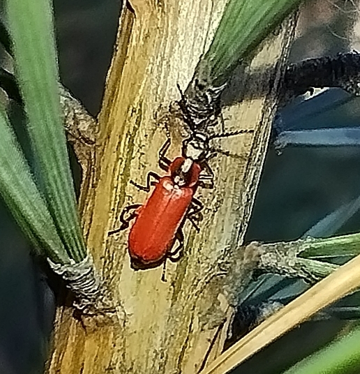 Этот маленький жучок (4-5 мм в длину) носит латинское название Anthocomus rufus, на русском собственного наименования не имеет, но в англоязычных странах зовётся красным малахитовым жуком.