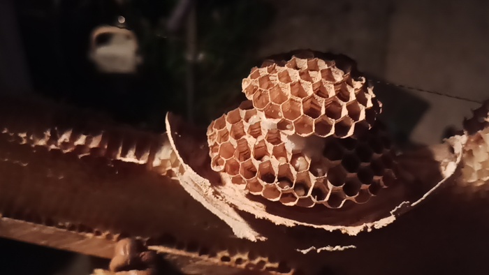 Подозрения, что что-то пошло не так, закрались в мою голову спустя пару дней, когда утренние нашествия пчел достали своей регулярностью. К тому времени уже выяснилось, что поутру в дом они летят из темных сеней на свет под дверью. Казалось бы, что проблема решается ранним открытием двери из сеней на улицу? Да, но это была только вершина айсберга. Потому что, как уже не трудно догадаться, ксилокопы поселились на чердаке. В бревнах, которые держат крышу. Пам-пам. Тут мы разрушаем миф о том, что они поселяются только в мягкой древесине, т.к. бревна под крышей вполне себе дубовые и твердость их сомнению не подлежит.