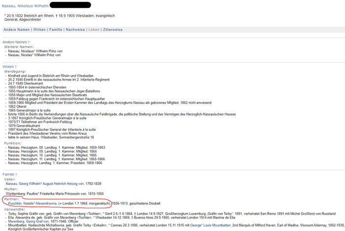 Так вот, в 1908 году в Альманахе Гота было опубликовано уточнение, что необходимо считать датой бракосочетания Николая Вильгельма Нассау и Натальи Александровны Дубельт (урождённой Пушкиной) не 1 июля 1867 года, а 1 июля 1868 года. Также было указано, что дата 1 июля 1867 года была сообщена редакции самой Натальей Меренберг в 1874 году, 2 мая (вот же ж, всё помнят!) и на проверку оказалась ошибочной. Поэтому, редакция Альманаха просит считать дату 1 июля 1867 года во всех своих выпусках, начиная с мая 1874 года – неверной (взято здесь: «L’Allemagne Dynastique , том 3 – Almanach de Gotha, 1908 г)