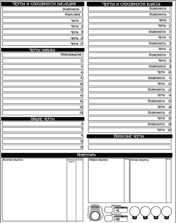 Уже более приятный для восприятия. Вот всё в нём хорошо, кроме одного - этот лист тоже должен быть у тебя перед глазами, ведь Черты - это важная часть твоего персонажа. Ну и конечно же в эти строчки невозможно написать пояснение к черте, так что пиши страницу и либо запоминай саму Черту, либо постоянно обращайся к правилам. Наконец, всего этого добра может не хватить из за любопытных синергий, например, общая Черта Воспитанник Народа даёт доступ к чертам отличного от вас народа, например людей, у которых есть Черта Природные Амбиции, которые дают Черту класса 1 уровня... Ну а нас ждёт третий лист: