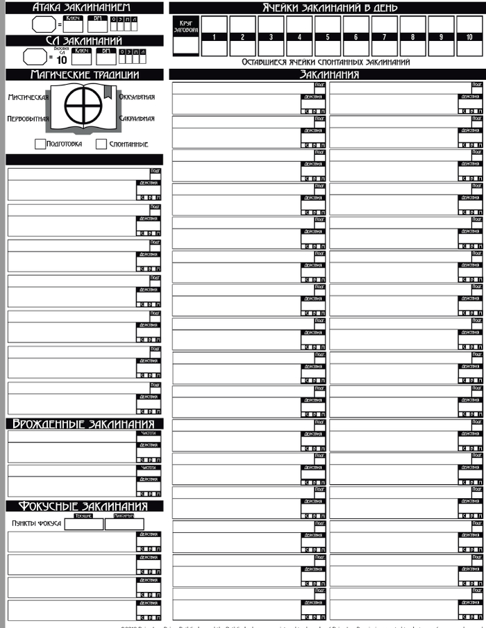 Это последний обязательный лист для немагических классов, который одновременно и абсолютно бесполезный, и совершенно необходимый. На первую половину зачастую забивают болт, а вот вторая... Дело в том, что помимо общих действий есть ещё и специальные, добавляемые с помощью Черт. Вот для их запоминания и существует этот лист. Ну и конечно же, этого листа может не хватить. Ну и последний лист, но не по важности, лист магии: