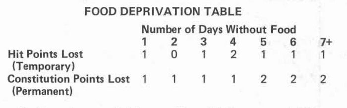 Для определения момента, когда игрок умирает от голода, ниже приведена таблица, показывающая последствия отсутствия пищи.