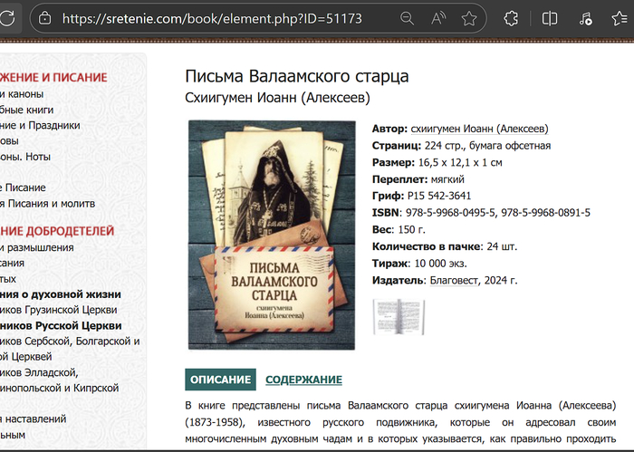 Книга "Письма Валаамского старца. Схиигумен Иоанн (Алексеев)", издана в 2024 году тиражом в десять тысяч экземпляров издательством "Благовест".
