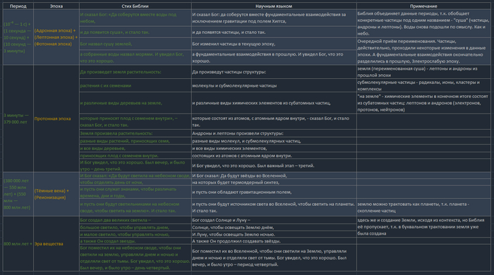 Пока хронология Библии и Большого взрыва удивительным образом совпадают... Мы не убрали ни одного стиха (и даже слова из Библии) и не пропустили ни один из этапов Большого взрыва.