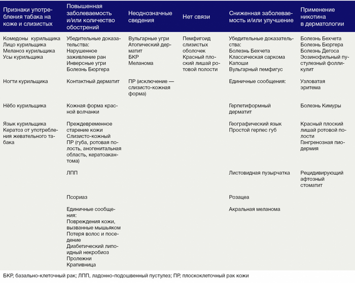 Эпидемиологические исследования установили как положительную, так и отрицательную взаимосвязь табакокурения с различными заболеваниями кожи. Положительная связь с определенными болезнями может благоприятно сказываться на их течении при прекращении курения, тогда как обратная — может требовать специфического лечения агонистами никотина. Важно понимать отличие действия табака и чистого никотина при болезни Бюргера.