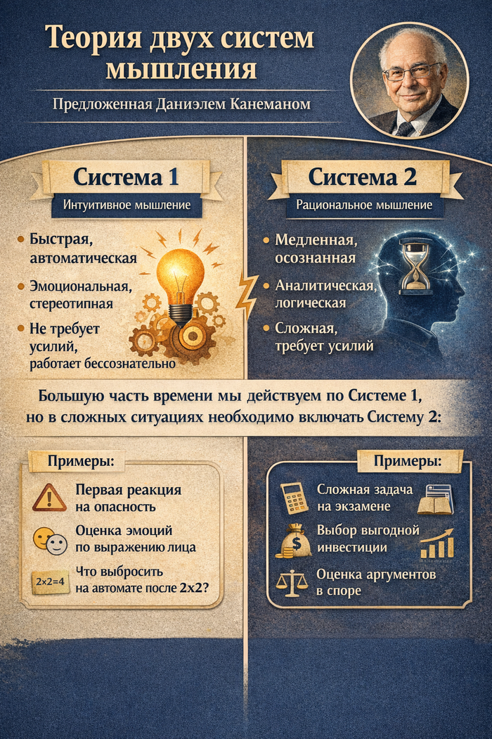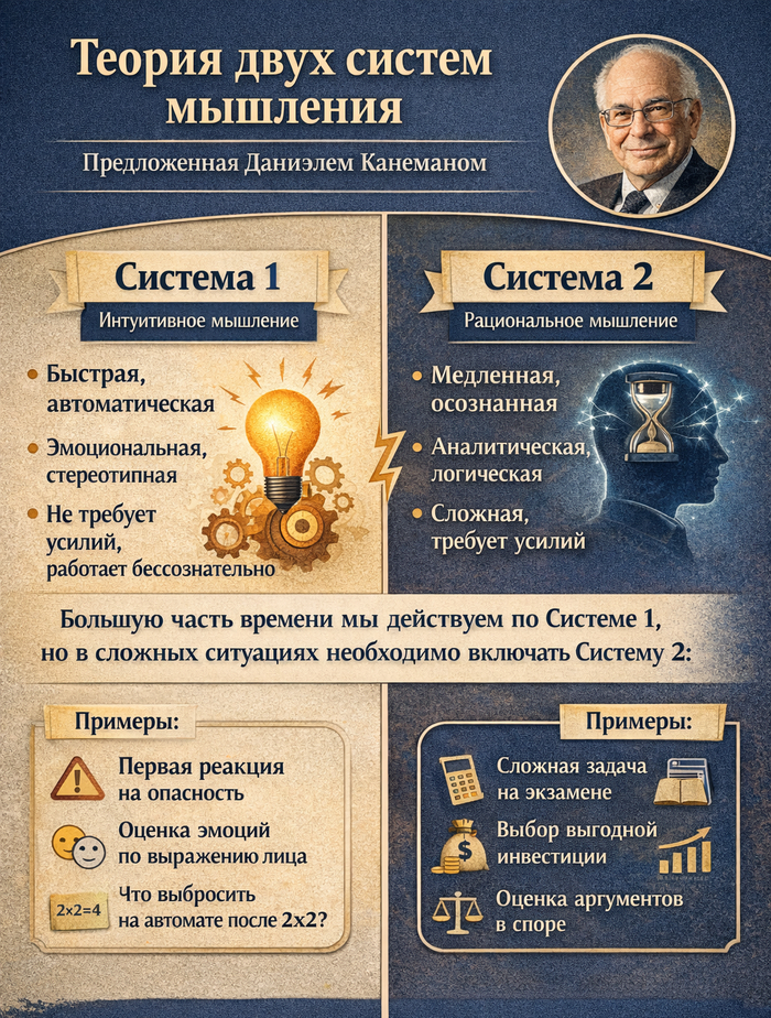 - Система 2 — медленная, аналитическая, требующая усилий.