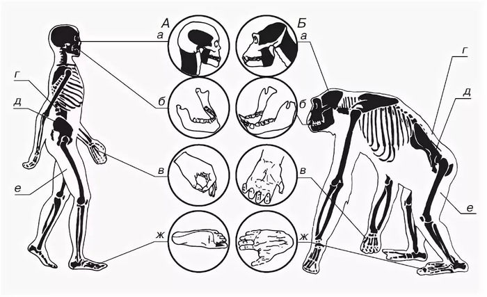 Фундаментальным отличием, определившим всю нашу анатомию, стал переход к прямохождению, что особенно ярко отразилось на строении позвоночника, таза и ног. Благодаря четырём изгибам, формирующим S-образную форму, позвоночник человека работает как пружина, амортизируя удары при ходьбе. Таз человека, в отличие от узкого и вытянутого таза обезьян, расширен, массивный и имеет форму чаши, чтобы поддерживать внутренние органы в вертикальном положении. Еще одним критически важным адаптационным элементом является сводчатая стопа человека, которая функционирует как сложный амортизатор с выраженным продольным и поперечным сводом, служа жёстким рычагом для отталкивания от земли при ходьбе. У обезьян же стопа плоская и хватательная, с противопоставленным большим пальцем, что удобно для лазания. Для лучшего удержания равновесия в вертикальном положении человеческая грудная клетка, в отличие от сжатой с боков у обезьян, расширена в стороны, что помогает сместить центр тяжести к центральной оси тела.