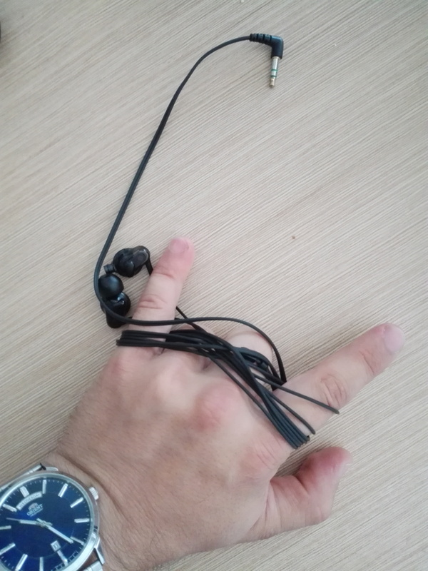 Складываем на одной руке "козу" (металлисты заценят), заматываем провод восьмёркой (или как знак бесконечности - кому что нравится) вокруг указательного и мизинца. Наушники можно зажать между безымянным и средним пальцами - на своё усмотрение, я не заморачиваюсь и делаю как на фото