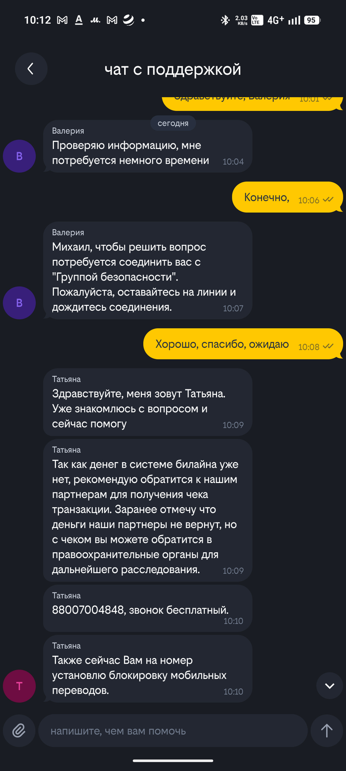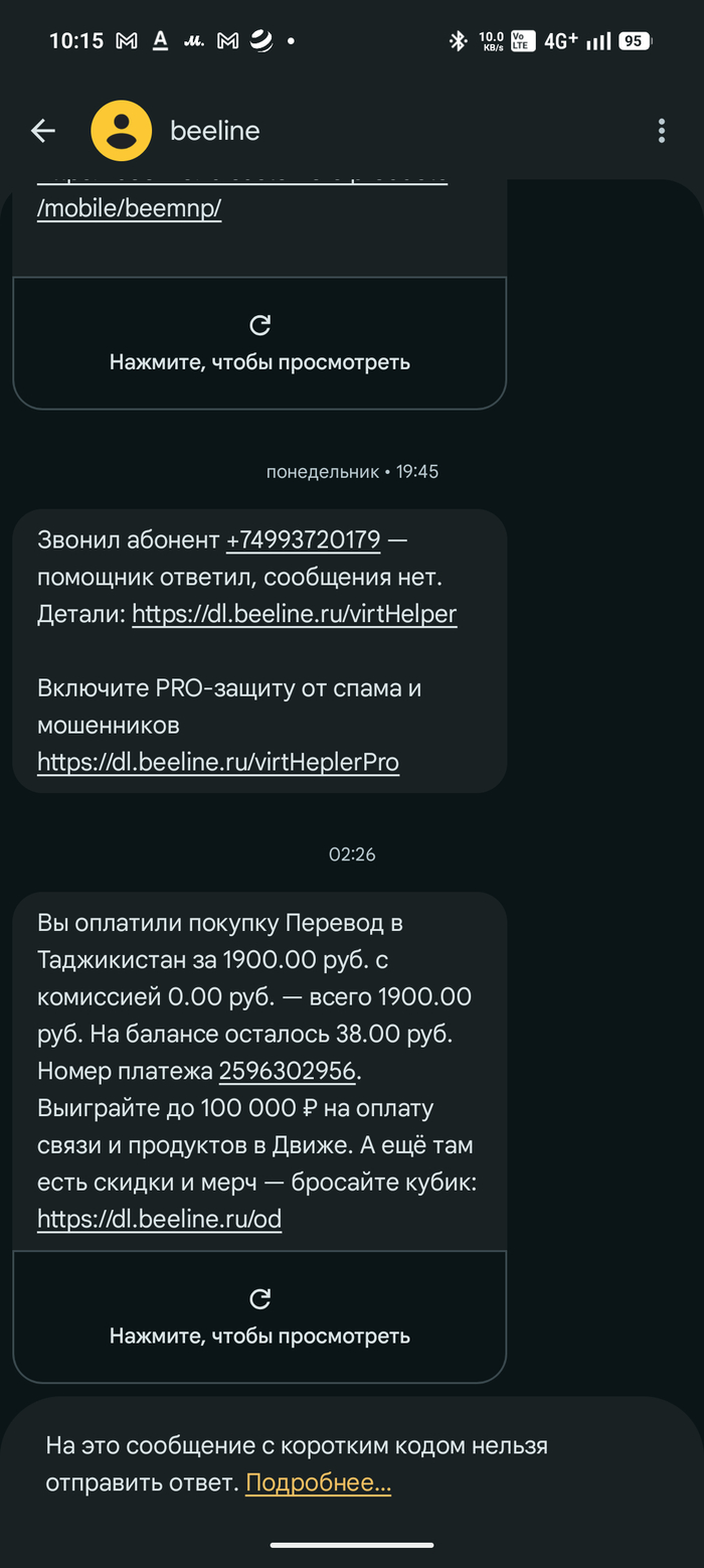 Для лл: кто-то как-то ночью совершил перевод с моего счета билайна и билайн с этим ничего не может сделать, так как денег у них нет. В общем-то проснулся сегодня и увидел сообщение в сплывашке наверху телефона о том, что был совершен перевод в такжикистан - 1900р. Подумал, ну наверное опять какой-то сервис разводняк прислал. Нет, прислал билайн.