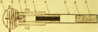 6. детонатор; 7. терочный состав; 8. колпачок запала; 9. шнурок.