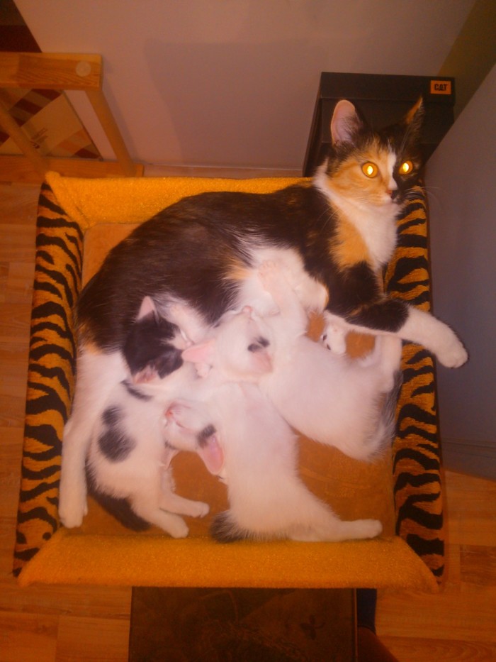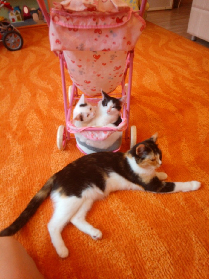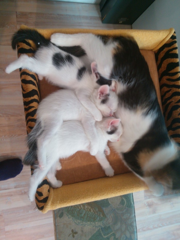 Токито оказался папашкой. Вылизывает,мурчит. Вообще болтать без умолку начал. За любой косяк малому лапой по голове. Джаз смирился. Одним котом больше- одним меньше. Лишь бы за жопу не кусали ( нет) .
