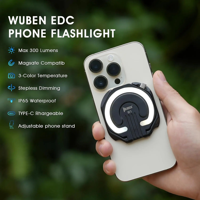 Встроенный аккумулятор обеспечивает до 70 часов работы в экономичном режиме, а зарядка осуществляется через порт USB Type-C. Благодаря мощным магнитам N54 фонарик надежно фиксируется на корпусе телефона и может использоваться как подставка с регулировкой угла наклона. Для смартфонов без MagSafe в комплекте идет магнитное кольцо-адаптер. Корпус выполнен из алюминия, что обеспечивает эффективный теплоотвод при длительной работе.