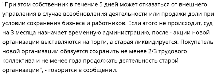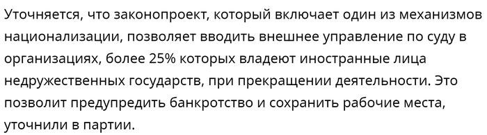 «Поручил разработать до понедельника проект федерального закона о национализации всего имущества, которое принадлежит украинским олигархам, политикам, государственным деятелям, открыто поддерживающим нацизм и киевский режим, и находится на территории Российской Федерации. Проект будет направлен в Госдуму. Напомню, что в начале марта Верховная рада приняла закон о национализации российской собственности на Украине.