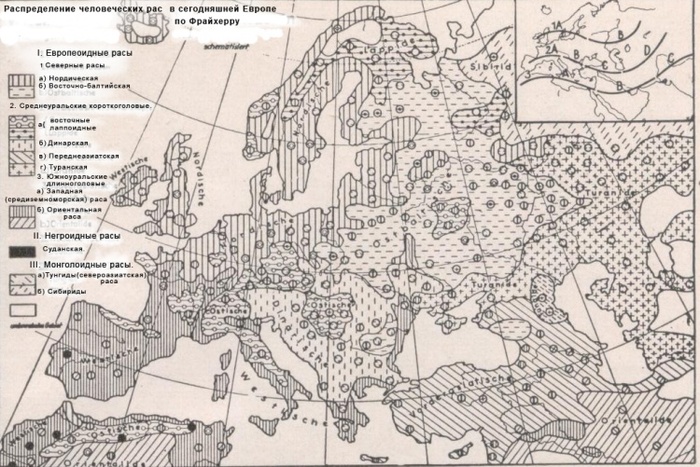 Поскольку многие из карт в книге Швидецки фиксируют смешанное состояние рас на территории славянских народов, взглянем на карту современного расселения рас в Европе из книги учителя Швидецки Ойгена Фрайхерра фон Эйкштедта «Расовые основы немецкого народа» (Die rassischen Grundlagen des deutschen Volkes), вышедшей в 1934 г. в Кельне[43]: