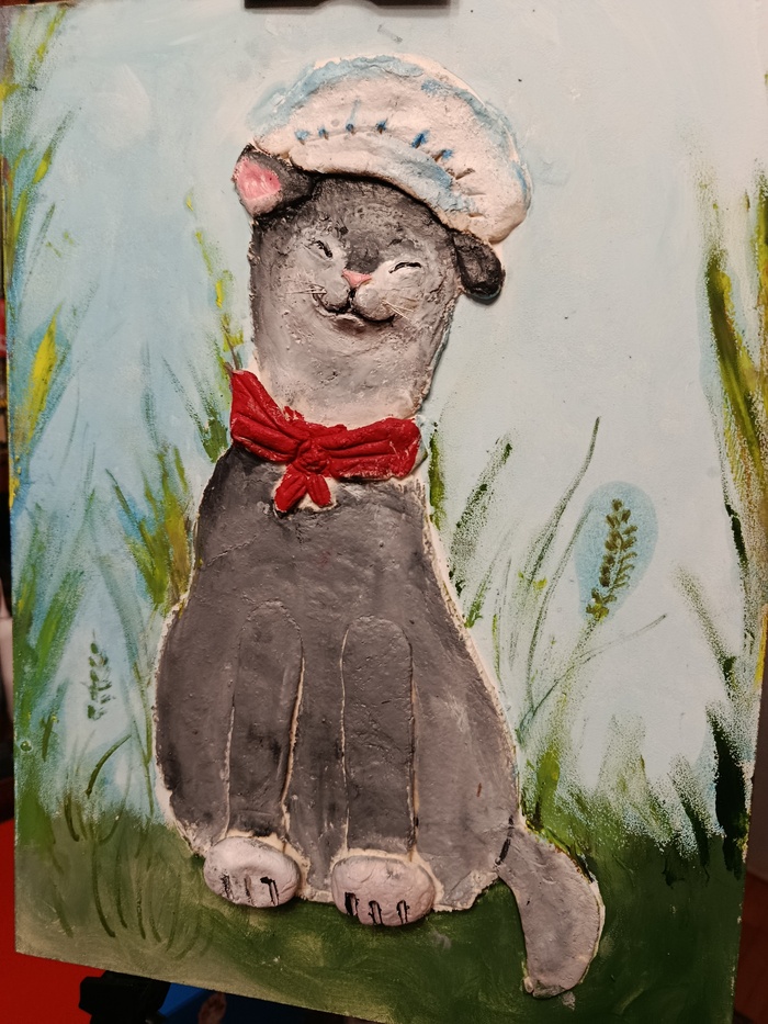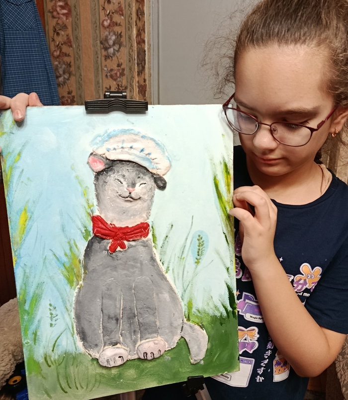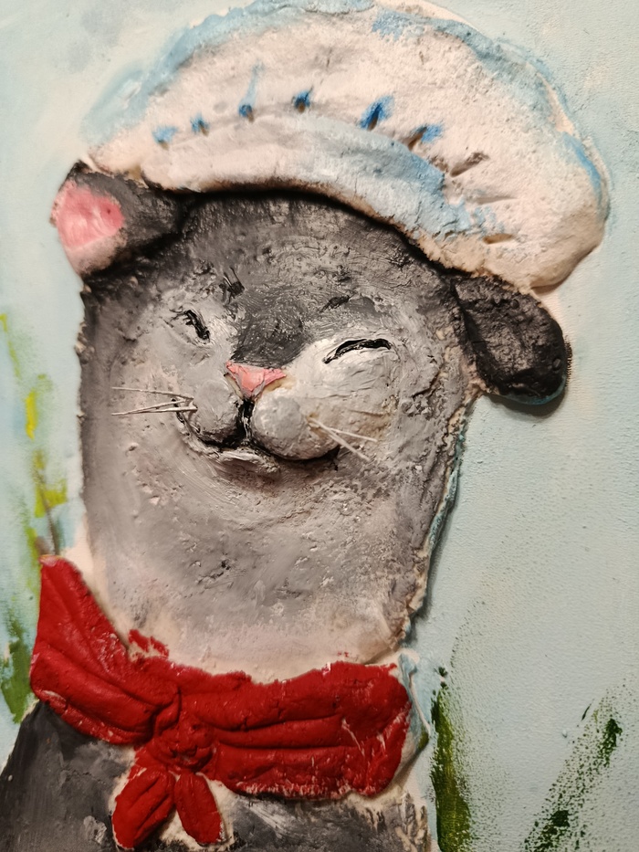 Для начала - новая картина (?) старшей дочери, Ульяны (9 лет), вернее, не знаю как это правильно называется - доска, тесто, масло, чуть-чуть лески, а на выходе "Кот-повар"