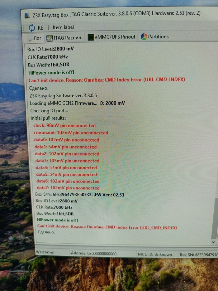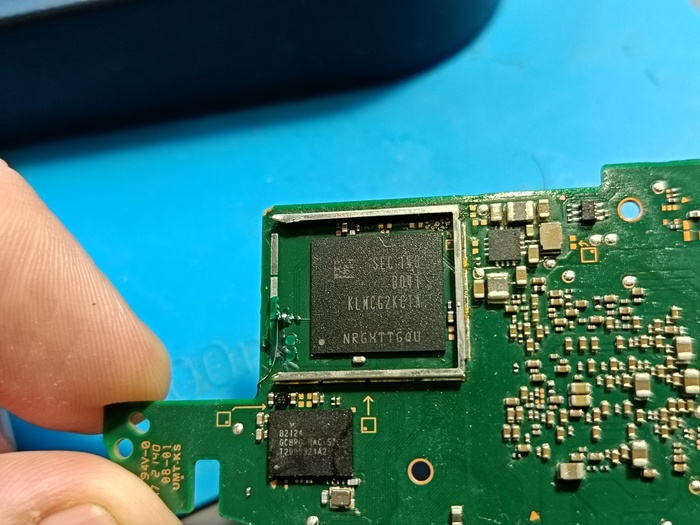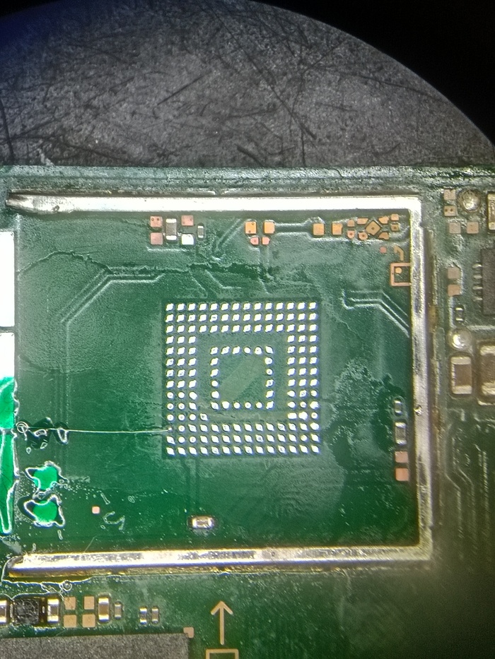 Снимаю emmc, К.З по всем линиям пропадают, проверяю emmc программатором, "она совсем не АЛЕ", программатор говорит, что нет падения напряжений между контактами emmc и её массой. Т. е emmc отправилась в Вальгаллу, отвал кристалла от подложки.